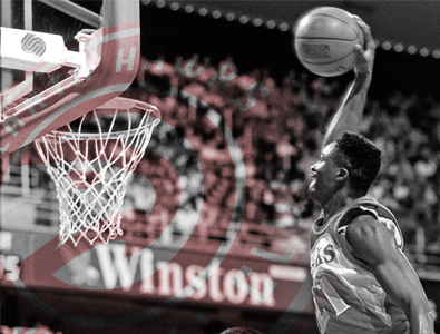 1990年、アトランタ・ホークスのドミニク・ウィルキンスは、サクラメント・キングスのケニー・スミスを僅差で破り、自身2度目のNBAスラムダンクコンテストで優勝しました。NBA史上最高の選手、ジョーダンを破ったこの大会での初勝利です。スミスは、バスケットに背を向け、両足の間を跳ね返してバックボードに当て、その後向きを変えて空中でボールを掴み、リバースダンクを決めるという、彼の代名詞とも言えるダンクで独創性を発揮し、高い評価を得ました。