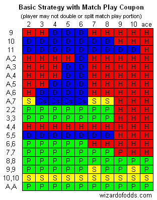 マッチプレイのベット部分をダブルしたりスプリットしたりできるかどうかによって異なります。通常はダブルやスプリットは許可されておらず、プレイヤーにとって不利に働きます。以下の表は、ダブルやスプリットの戦略を調整する方法を示しています。マッチプレイのダブルは許可されておらず、スプリットする場合は最初のハンドの勝敗が決定されます。これは、インフィニットデッキとディーラーがソフト17でスタンドしている場合を想定しています。ヒット/スタンド戦略も同様です。
