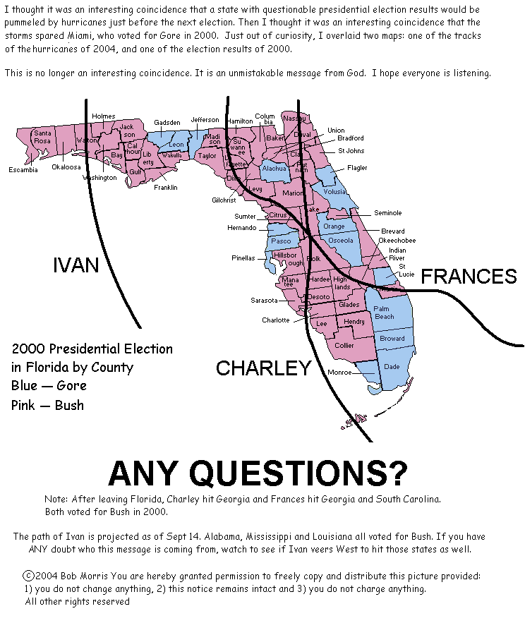 2000 年にゴアに投票した郡がすべて、最近フロリダを襲った 3 つのハリケーンによる被害を免れたという事実によって証明されている、神は民主党員であるという以下の主張について、どう思われますか。