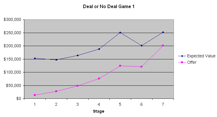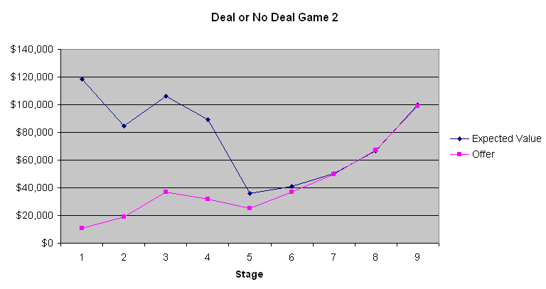 次のグラフは、プレイヤーの期待値とバンカーのオファーを示しています。