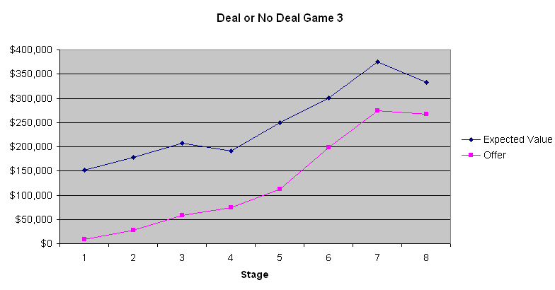 これら3つのチャートから最も明白なことは、最初の4~6回の銀行のオファーがひどい取引だということです。平均的なスーツケースには、開けられる前に131,477.54ドル入っています。最初の段階で9,000ドルから13,000ドルしか提示しないのは、愚か者だけが行う取引です。しかし、徐々にオファーは良くなっていきます。ゲーム2では、プレイヤーの期待値がかなり低かったゲーム終盤では、期待値が銀行のオファーとほぼ同じだったことがわかります。しかし、期待値が高かったゲーム1と3では、銀行は明らかに、高額が絡むとほとんどの人がリスクを嫌う性質を利用しようとしていました。それが重要かどうかはわかりませんが、ゲーム2の出場者は大金を獲得したいギャンブラーのように見えました。電話で銀行員と連絡を取っている司会者のコメントに基づくと、銀行員は出場者の言動を慎重に見ているように見えます。私が銀行員の立場だったら、同じように行動するでしょう。