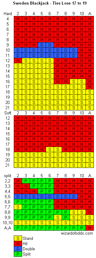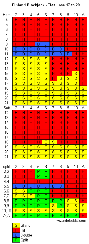 どちらの場合も、ディーラーはソフト17でスタンドすると想定しています。スプリット後のダブルはスウェーデンでは認められていますが、フィンランドでは認められていないと理解しています。スウェーデンではハウスエッジが5.99%、フィンランドでは8.93%だと仮定します。基本戦略チャートはこちらです。