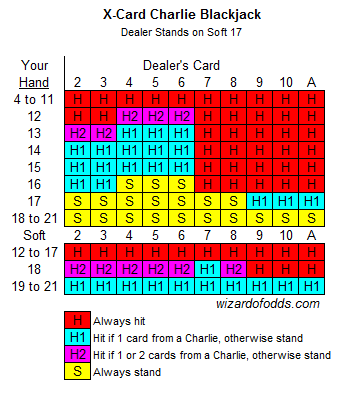 どういたしまして。質問の意味がわからない読者のために説明すると、「チャーリー」とは、プレイヤーがバーストすることなく、一定枚数(通常は5~7枚)のカードをヒットした場合、自動的に勝利となるルールです。以下の表は、3枚以上のカードの場合で、プレイヤーがそのような自動勝利からあと1~2枚のカードしか離れていない場合の基本戦略を示しています。