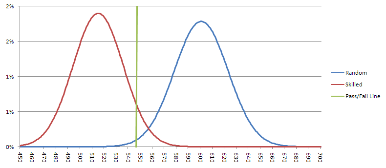 7人に1人のシューターは、平均514.3個の7を投げ、標準偏差は21.00です。ガウス近似を用いると、そのような熟練シューターが548個以上の7を投げる確率(偽陰性)は5.7%です。ランダムシューターは平均600個の7を投げ、標準偏差は22.36です。ランダムシューターがテストに合格する確率(偽陽性)は0.94%です。下のグラフは、熟練シューターとランダムシューターの可能性のある結果を示しています。結果が緑の線より左側にある場合、私はそのシューターがテストに合格したと見なし、彼に賭けます。