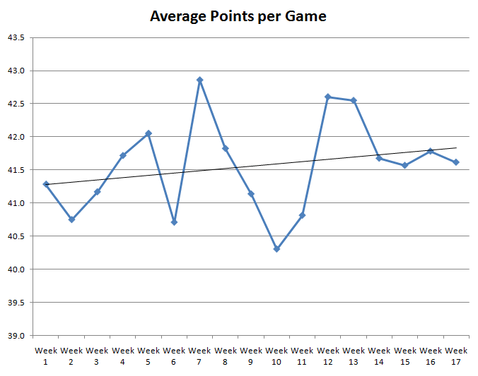 この質問に答えるために、私は 1983 年から 2009 年までの各シーズンに基づいて、NFL の週番号別に獲得した平均ポイントをグラフ化しました。次のグラフは結果を示しています。