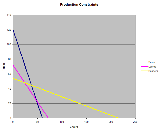 次のグラフは、3組の機械によって課される3つの制約を示しています。工場は、3本の線すべてに該当する椅子とテーブルの組み合わせを自由に生産できます。問題は、3本の線のうちどの線に該当する場合、収益が最大になるかということです。