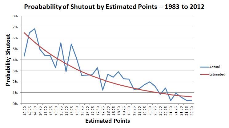 次のステップはここで説明するには複雑すぎるが、推定ポイント数に基づいて完封の確率を計算する式を開発しました。