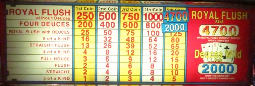 はい、そのマシンはもうありません。ご指摘の通り、以前は2位だったゲームが、今では1位に躍り出ています。エル・コルテスのダブルデュースゲームは配当100.92%です。ペイテーブルは940-400-25-16-13-4-3-2-2-1です。カジノの北端にある、古いカソードローマシンが並ぶスロットルームで見つけることができます。私がその横に立っている写真がこちらです。