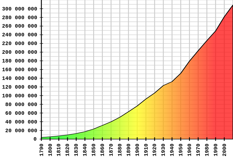 しかし、人口は安定していません。このグラフを見ると、米国の人口は10年ごとに10.71%増加していることがわかります。つまり、年間1.02%です。ここでは単純に1%と仮定しましょう。