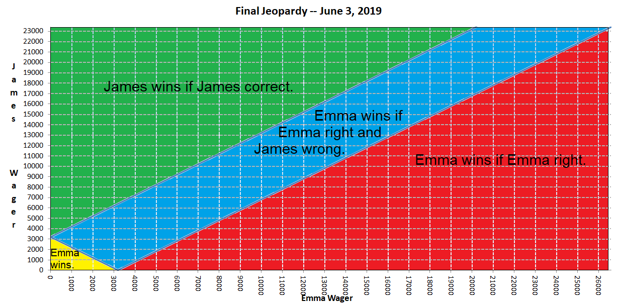 2位が1位の半分以上のスコアを持ち、3位がそうでない状況では、通常、1位と2位が最終賭け金を高くするか低くするかで勝負が決まります。1位に高く賭ければ、正しく賭ければ勝利が確定します。具体的には、2位のスコアの2倍から1位のスコアを差し引いた金額に1ドルを加算した金額です。エマはまさにこの賭け方で、2×23,400ドル - 26,600ドル + 1ドル = 20,201ドルを賭けました。多くの場合、1位のプレイヤーはこのように賭けます。