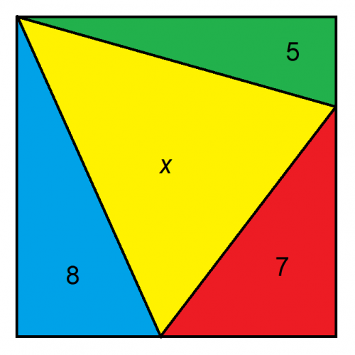与えられた3つの三角形の面積は5+7+8=20です。これを正方形の総面積から引くと、xの面積は20 + 4*sqrt(15) - 20 = 4*sqrt(15) = 約15.4919になります。
