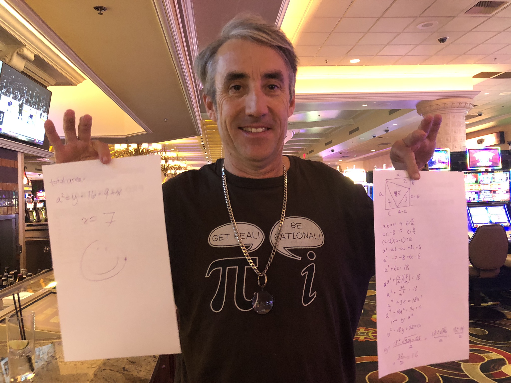 この写真の私のTシャツに注目してください。映画『 アンカット・ジェムズ』を見に行った時、映画館のレジ係の人がそれを褒めてくれました。お礼に、面積2、3、4の三角形だけを使ったこの問題で彼女を苦しめました。映画が終わって彼女に確認すると、まだ解けていなかったものの、頑張っているようでした。そこで、サンコーストのバーで次の解法を彼女に書いてあげました。彼女は本当に喜んでくれたようでした。この若い女性はきっと将来大成するでしょう。