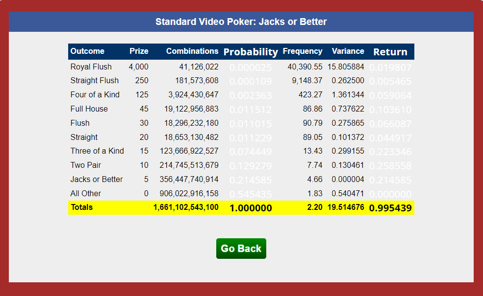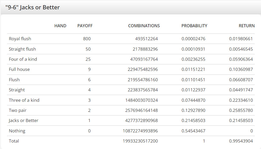 9-6ジャックス・オア・ベターのビデオポーカー計算機では、テーブルの組み合わせの総数は1,661,102,543,100と表示されています。一方、ジャックス・オア・ベターのページでは、組み合わせの総数は19,933,230,517,200と表示されています。組み合わせの数は同じであるべきなのに、なぜこのような違いがあるのか疑問に思います。リターン(0.995439)は同じに見えます。