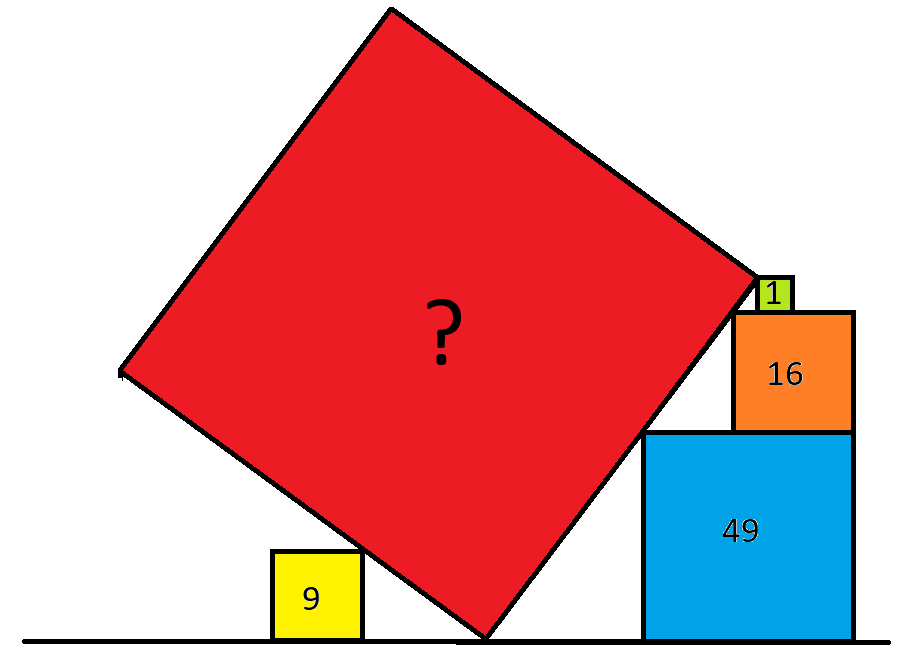 上の画像では、数字は4つの正方形の面積を表しています。赤い正方形の面積はいくらでしょうか?