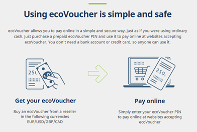 公式サイトにも明記されているように、ecoVoucherはプリペイド式の電子決済サービスで、ユーザーは迅速かつ安全に資金を送金できます。しかし、このソリューションにはさらに便利な機能が1つあります。それは、ecoAccount、より正確にはecoPayzへのチャージに使用できることです。