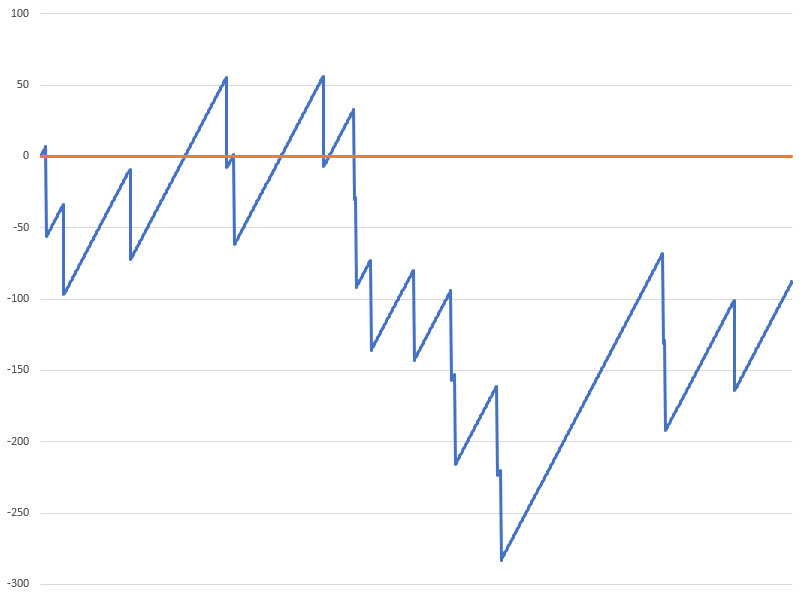 プレイヤーが最大6回連続で負ける状況を考えてみましょう。そのためには、勝利目標の63倍の資金が必要です。1ユニットの勝利目標を達成する確率は98.3051%です。プレイヤーがこれを繰り返した場合、63ユニットの負けセッションごとに平均58.000094回の勝利セッションが期待できます。63ユニットの損失は、負けの間の58回の勝利よりも大きいことに注意してください。最終的に、プレイヤーが資金を1ユニットずつ倍増させるか破産するまでこれを繰り返した場合、資金を倍増させる確率は34.0634%です。