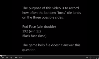 - 3つ目のサイコロは「ボス」と呼ばれ、勝利の倍率として機能します。倍率は0、1、2のいずれかです。これらの倍率の配分はヘルプファイルに記載されていません。しかし、後ほど6面の配分が以下の通りであることを裏付ける証拠を提出しました。