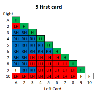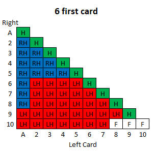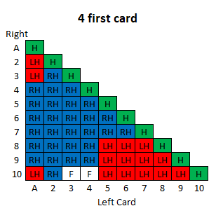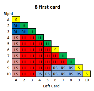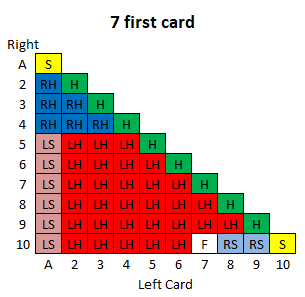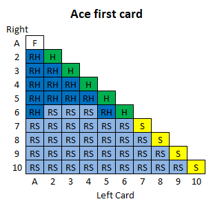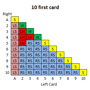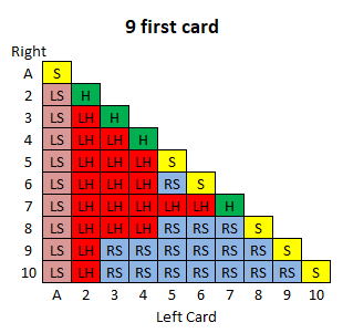 初期プレイヤーカードごとに10個の戦略表があります。各表を使用するには、一番下の行の左側のカードと左の列の右側のカードを調べてください。10番目の表の後にキーが続きます。