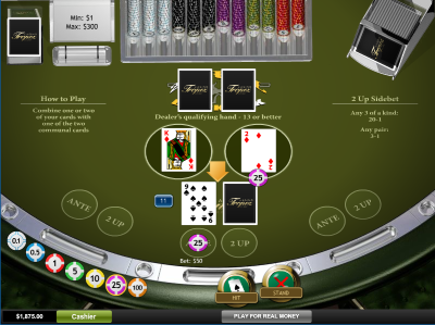 - 2アップサイドベットは、プレイヤーの最初のカードと2枚のコミュニティカードに基づいて配当が決まります。スリーカードの場合は20倍、ペアの場合は3倍の配当となります。