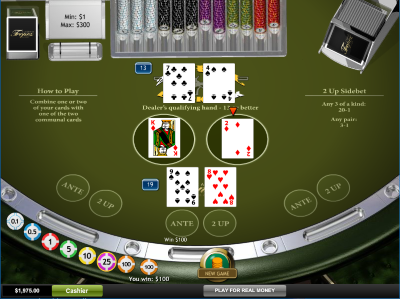 - プレイは、プレイヤーがアンティ ベットとオプションの 2 アップ サイド ベットを行うことから始まります。
