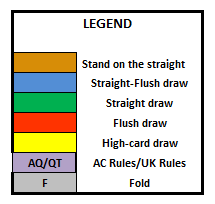 - その他のハンドのドロー戦略はかなり複雑で、以下で説明します。ベッティング戦略は比較的簡単で、以下のいずれかの場合はレイズし、それ以外の場合はフォールドします。