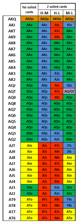 - AKx、AQx: – AJ、AT、A9sが引ける場合を除き、常に2枚の最高カードが引けます。