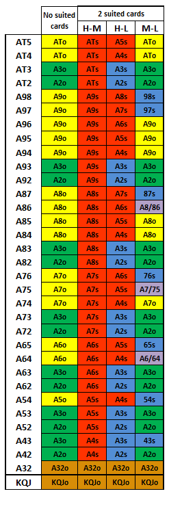 - AJx-A4x: - スーツが同じAxならドロー。次に優先順位が高いのは、A3oまたはA2oのストレートドロー。次に優先順位が高いのは、最も高い2枚のカードがドローになること。
