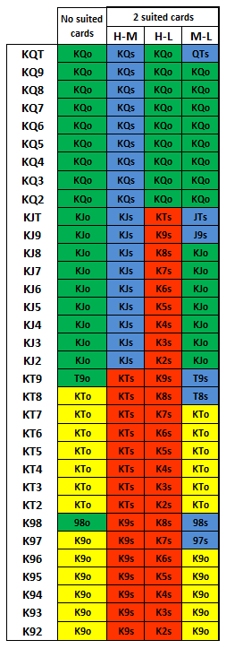 - KJx - QTx: スーツが同じKxまたはQxならドロー。そうでない場合は、最も高い2枚のカードでドロー。