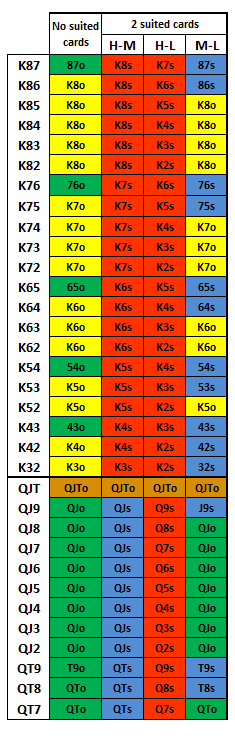 - Q9x – 53x: 可能であれば、隣接するランクのカード2枚を引きます。次に優先順位が高いのはJ9またはT8です。そうでない場合はフォールドします。2枚のスーツが同じハイカードハンドを引きます。