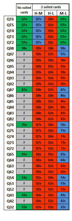 上記が明確でない場合は、Q32 から AKQ までのどのカードを保持するかについての次の戦略表も示します。