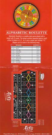 アルファベットルーレットは、2011年8月7日にラスベガスのフィッツジェラルドで見たルーレットの一種です。色と文字の両方が使われるシンプルなルーレットです。25個のマスがあり、AからXまでの各文字と、YとZのマスがそれぞれ1つずつあります。また、6色あり、それぞれ4文字で構成されています。YZはシングルゼロルーレットの0と同じように扱われ、色は付いていません。