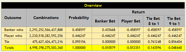 以下の配当表は、6デッキゲームにおけるプレイヤー、バンカー、タイの賭けの結果を示しています。各表の右下のセルに示されているように、ハウスエッジはバンカーで1.06%、プレイヤーで1.24%、タイで14.44%です。