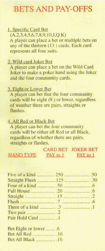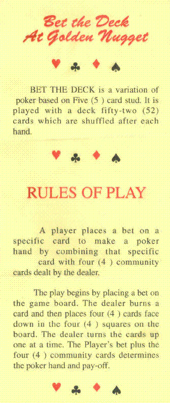 ベット・ザ・デックは、2005年4月にゴールデンナゲットで見つけたテーブルゲームです。シンプルなポーカーの一種で、プレイヤーは5枚のスタッドハンドの結果に賭けます。ポーカーハンドは、4枚のコミュニティカードとプレイヤーが選んだ5枚目のカードで構成されます。以下はルールカードのスキャンです。