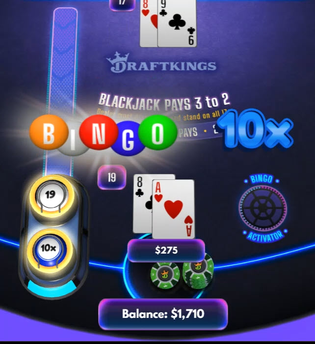 上記のハンドでは、25ドルに加え、ビンゴアクティベーター手数料5ドルを賭けました。ターゲットは19、マルチプライヤーは10倍でした。配られたのはソフト19で、スタンドしました。ディーラーは17でした。私の19が勝ったので、10倍の配当が支払われ、合計250ドルの勝利金と、元の賭け金の払い戻し分を合わせて、合計275ドルの払い戻しとなりました。