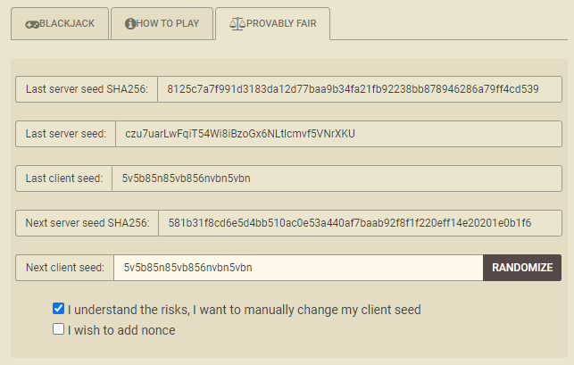 プログラムは、賭ける前に提供されたサーバー シード ハッシュとゲームで配られたカードとを照合します。