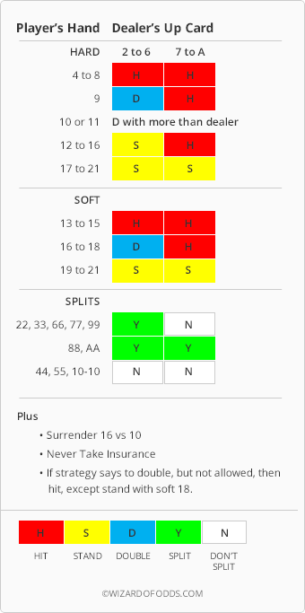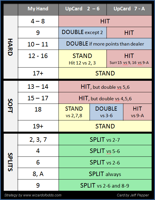 ジェフという読者から、私のシンプルな戦略を別の表で提供していただきました。例外は小さな文字で書かれています。ウィザードのシンプル戦略の詳細については、ブラックジャックの付録21をご覧ください。