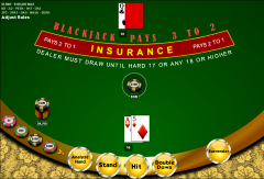 - ディーラーがエースを出している場合、「インシュランス」と呼ばれるサイドベットを提案します。このサイドベットは、ディーラーのホールカードが10ポイントのカードであれば2倍の配当となります。インシュランスは任意で、元の賭け金の半分を超えることはできません。
