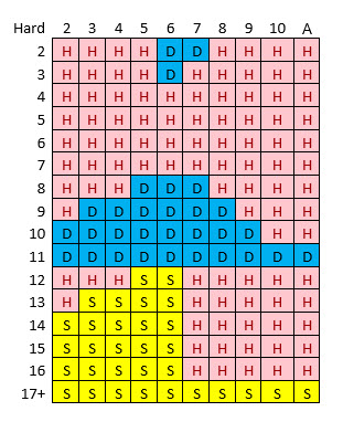 それ以外の場合、ハード合計では、プレーヤーは次の基本戦略表に従う必要があります。