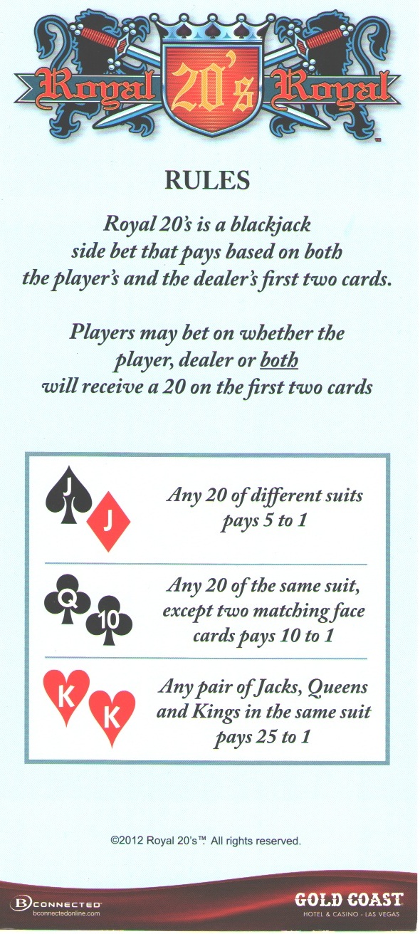 ロイヤル20は、プレイヤーの最初の2枚のカードに基づいて賭けるブラックジャックのサイドベットです。合計が20点の場合、プレイヤーの勝ちは最大25倍になります。私は2017年2月28日にラスベガスのキャナリーカジノでこのゲームを目にしましたが、少なくとも2012年から存在していることは知っています。