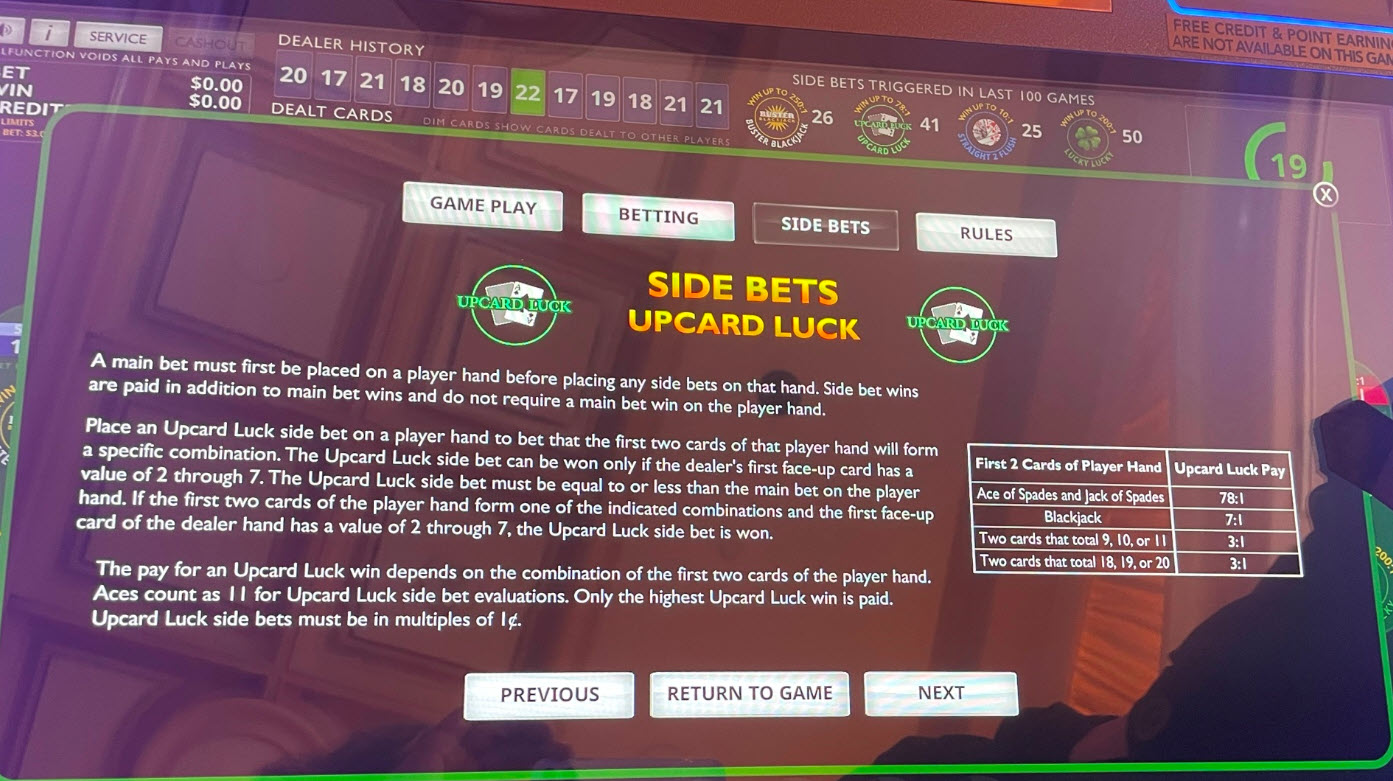 アップカードラックは、IGTのダイナスティブラックジャックゲームでプレイできるサイドベットです。最初のカードが配られた後、プレイヤーが有利な状況であれば勝ちとなります。勝つには、ディーラーの表向きのカードが2~7で、プレイヤーの表向きのカードがブラックジャック、または9~11もしくは18~20である必要があります。