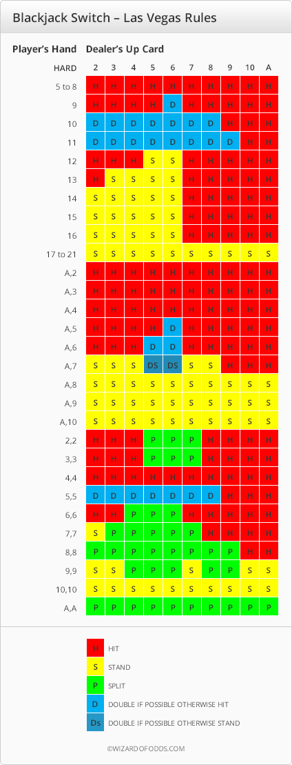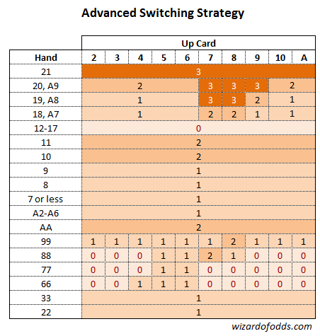 以下の表は、スイッチの決定後、8デッキのラスベガスルールにおける基本戦略を示しています。従来のブラックジャック戦略と異なるのは、22プッシュルールによるものです。