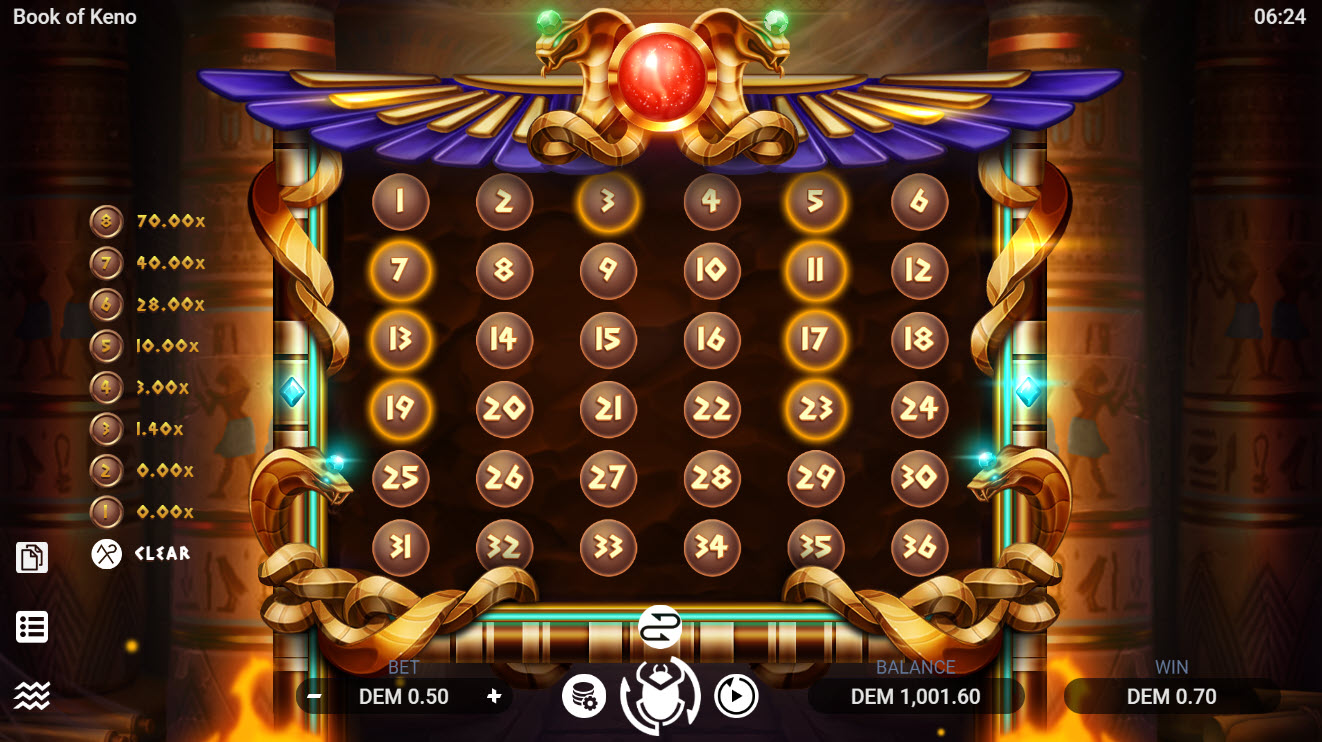 Book of Kenoは、インターネットカジノ向けゲームを開発するソフトウェア会社、 Evoplay Entertainmentが開発したキノのバリエーションです。通常のキノと同じように機能しますが、ボールの数が80個ではなく36個です。
