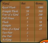 - ボーナスサイドベットは、プレイヤーのハンドのポーカーバリューに基づいて決定されます。配当表は以下の通りです。