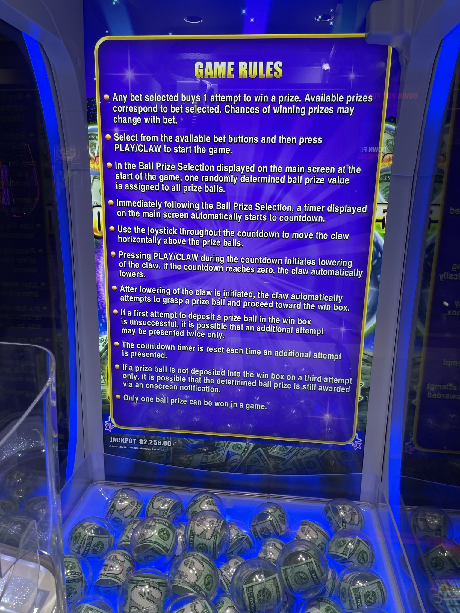 - ルールでは、プレイヤーが勝利を確定しているにもかかわらず、クローが誤ってシュート前にボールを放出した場合、ゲームは最大3回まで再試行されます。3回目の試行後もボールがシュートに到達しない場合でも、プレイヤーの賞品はディスプレイに表示されます。