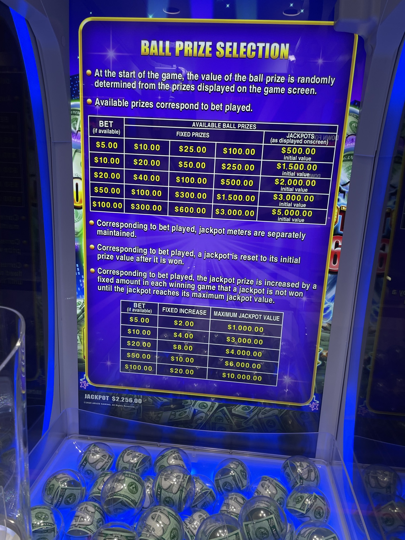 - 10ドル:20ドル、50ドル、250ドル、ジャックポット
