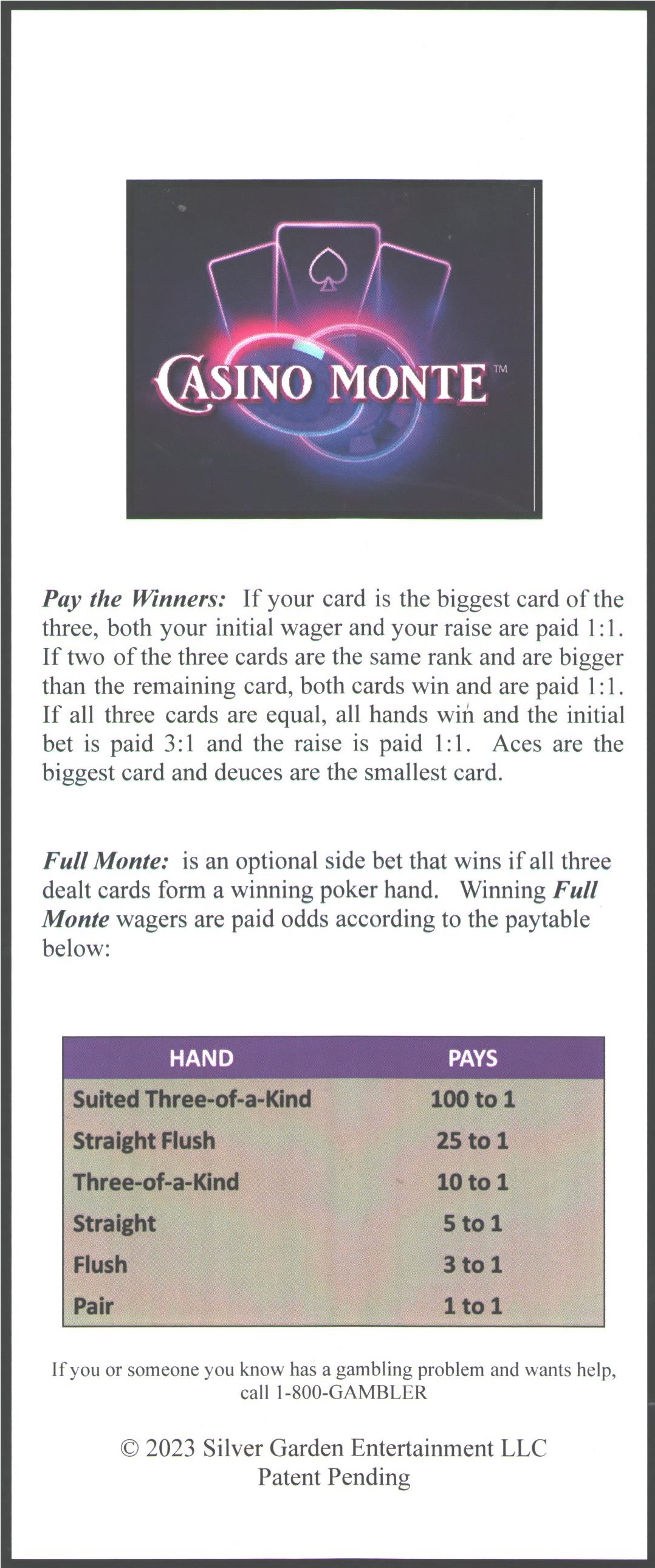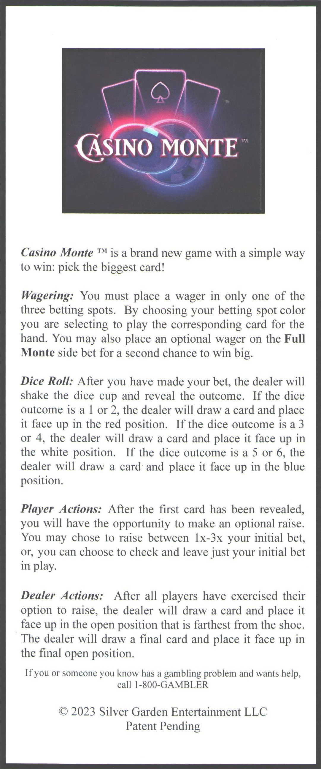 カジノモンテは、3枚のカードを使ったシンプルなカジノゲームです。プレイヤーは、最も高いカードが並ぶ位置を予測すれば勝ちとなります。同点の場合は勝ちとなり、1枚目のカードが公開された後にレイズするチャンスがあります。