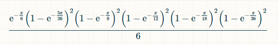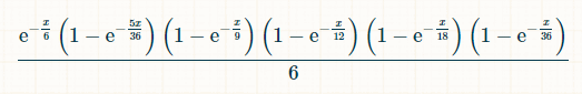 x 単位の時間で、2、3、4、5、6 が出ていて、7 が出ていない確率は次のとおりです: (1-exp(-x/36))*(1-exp(-x/18))*(1-exp(-x/12))*(1-exp(-x/9))*(1-exp(-5x/36))*exp(-x/6) プレイヤーがそれまでに 2 から 6 までのすべての合計を出した後、時刻 x に 7 を出す確率は次のとおりです: