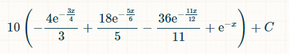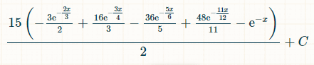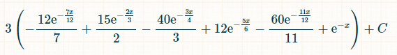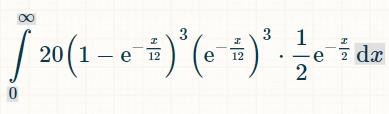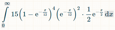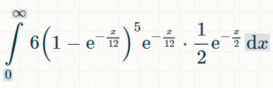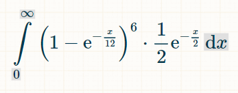 これを積分するには、この積分計算機をおすすめします。積分フィールドに「(1-exp(-x/12))^6*(1/2)*exp(-x/2)」と入力します。積分の限界については、オプションで0と∞を入力します。「実行」をクリックします。「以下の積分が得られます。