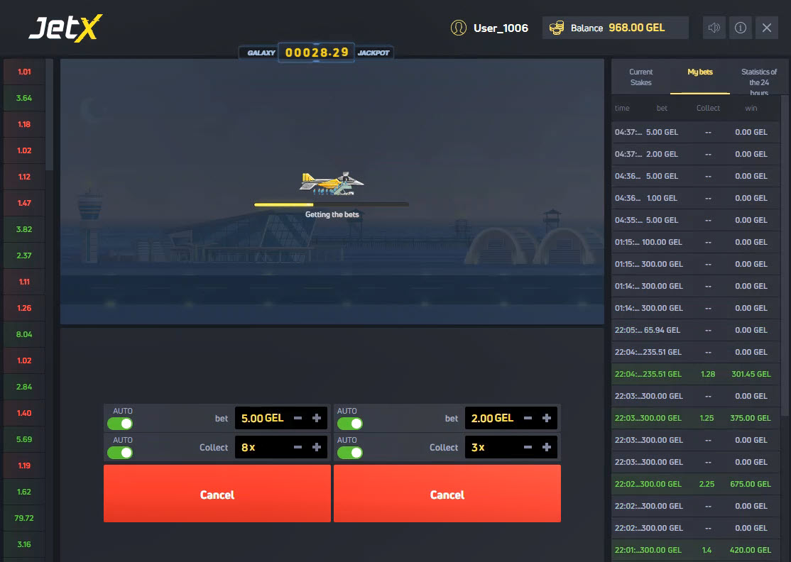 2つの賭けをする前、残高は975 GELでした。正直言って、GELが何なのか全く分かりません。ゲームはファンモードでプレイしました。上の画像のように、2つの賭けをしました。左下のボックスに表示されている最初の賭けは5で、勝ち目は賭け金の8倍、つまり40です。右下のボックスに表示されている2の賭けは2で、勝ち目は賭け金の3倍、つまり6です。これらの賭けが確定した後、このスクリーンショットが撮られる前に、上部の残高フィールドにあるように、私の残高は7減って968になりました。