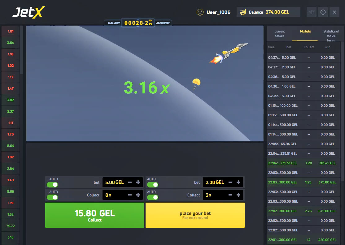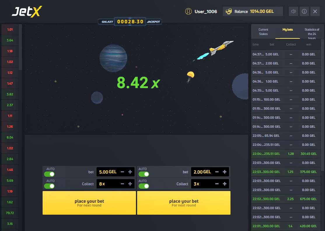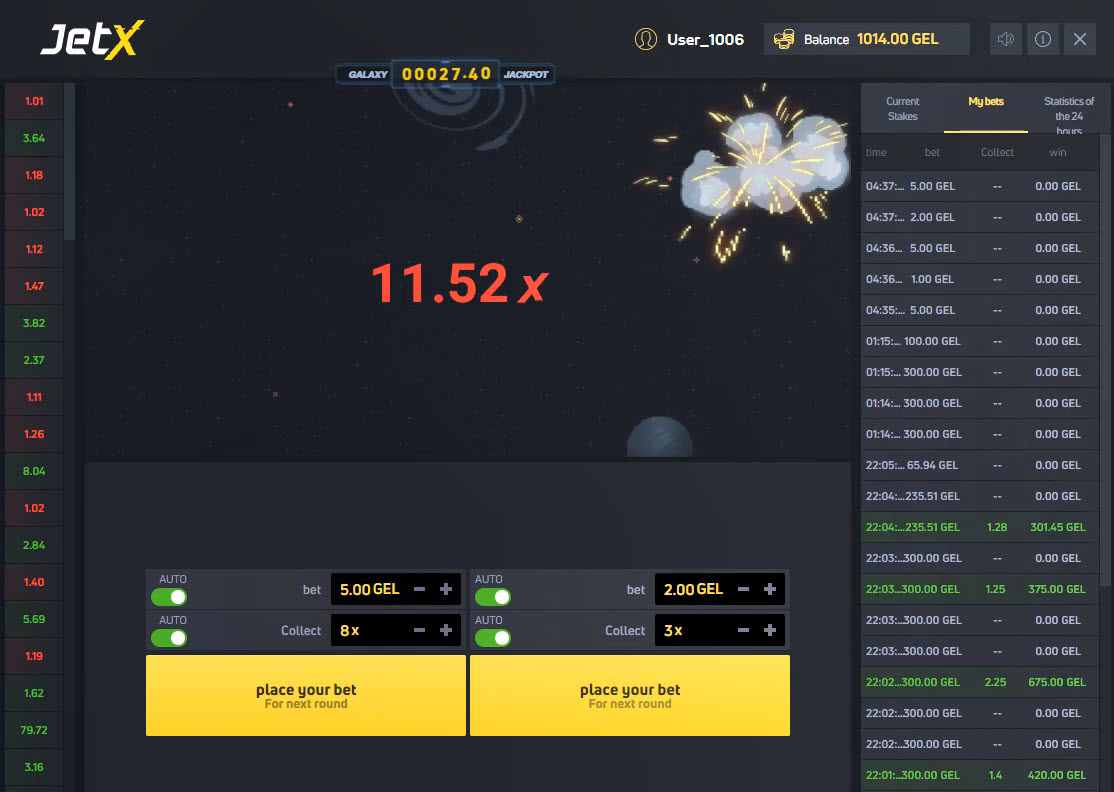 別に大したことではありませんが、宇宙船は爆発するまで上昇を続けます。今回の場合、爆発時の配当は11.52倍でした。また、私の残高は1014GELです。念のためですが、賭け金を合計すると残高は968GELでした。左側の賭け金は5×8=40、右側の賭け金は2×3=6でした。合計勝ち額は40+6=46です。つまり、新しい残高は968+46=1014です。